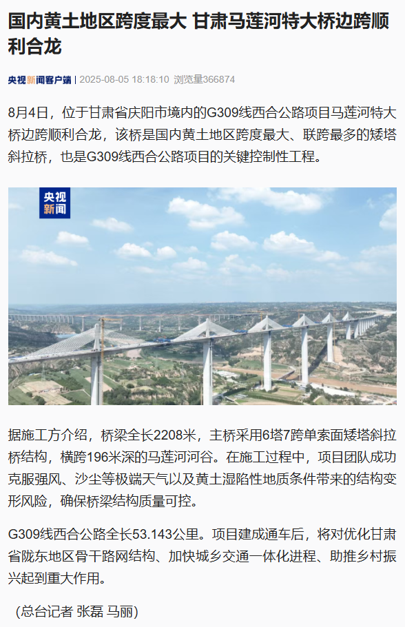 - 甘肅工程咨詢集團監理項目取得重大突破:國內黃土地區跨度最大 甘肅馬蓮河特大橋邊跨順利合龍